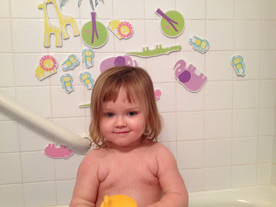 Auntie Ema (and Uncle Jeff) also got her these super fun toys for the tub. I dumped the bag into the tub with her the first night she played with them and she was perfectly content to play with the animals, making them swim around. She's getting pretty good at saying "hippopotamus" - she wants to try to say that rather than just "hippo!" and making a lion's "Roar!" So she was having a good old time...but then I showed her how the animals could stick to the wall and it was Christmas all over again! Her eyes lit up and she said "Me!" and put the rest of them up there herself.